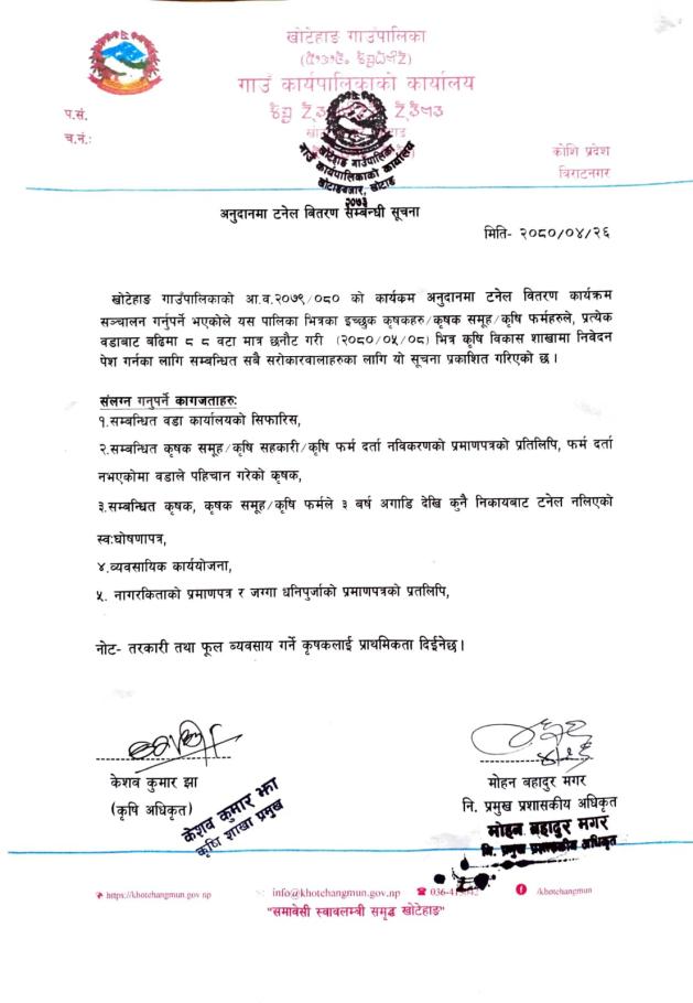 अनुदानमा टनेल वितरण सम्बन्घी सूचना ।