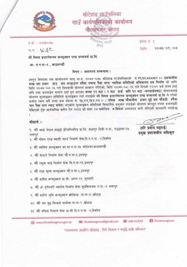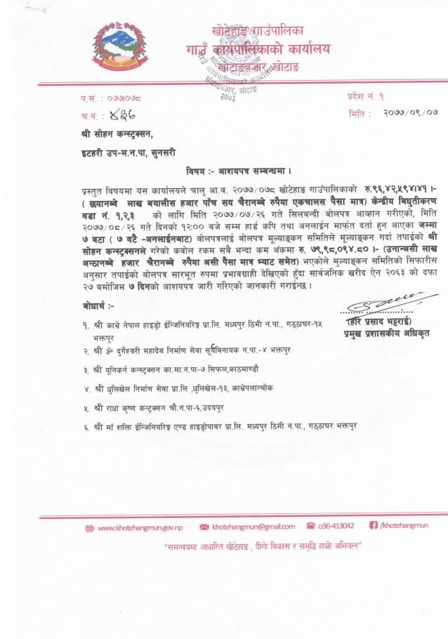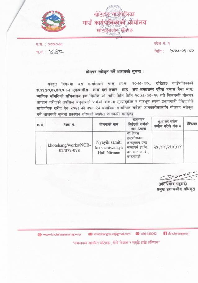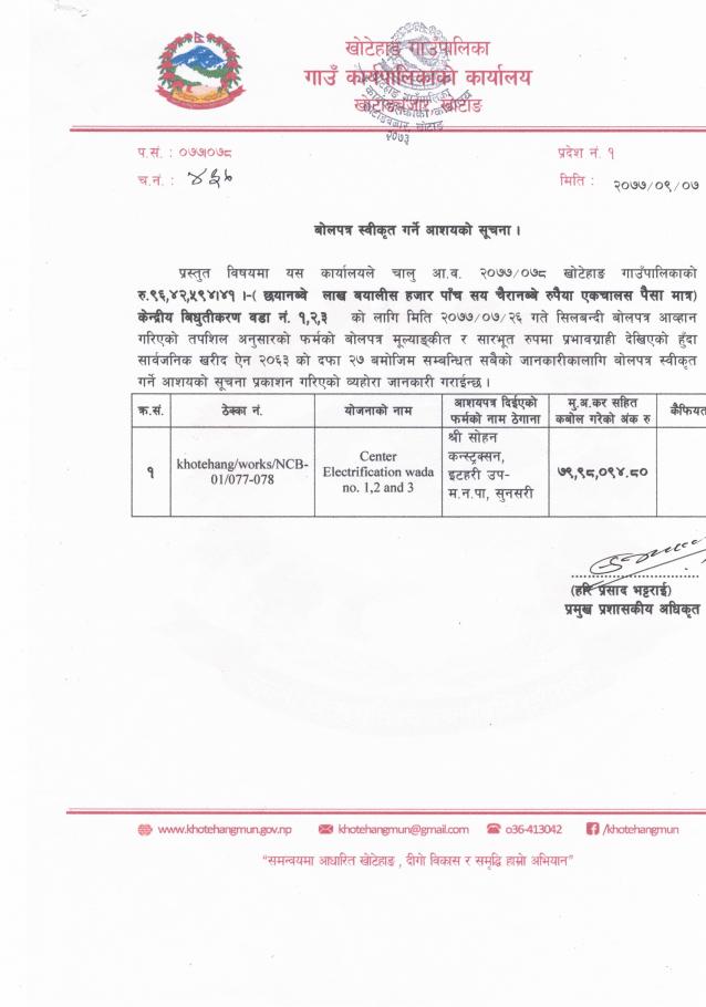बोलपत्र स्वीकृत गर्ने आशयको सूचना